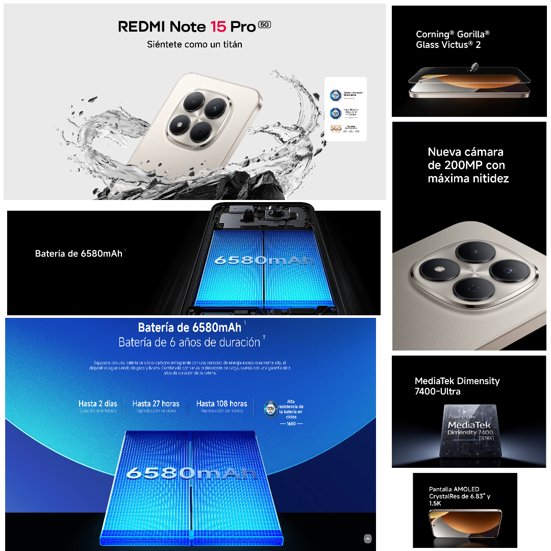 En diseño, el Redmi Note 15 Pro presenta un acabado moderno y elegante, con bordes bien definidos y una construcción sólida. Incluye lector de huellas bajo la pantalla, altavoces estéreo, conectividad NFC y compatibilidad con redes 5G en sus versiones correspondientes, lo que lo convierte en un dispositivo completo y actualizado para las necesidades actuales.